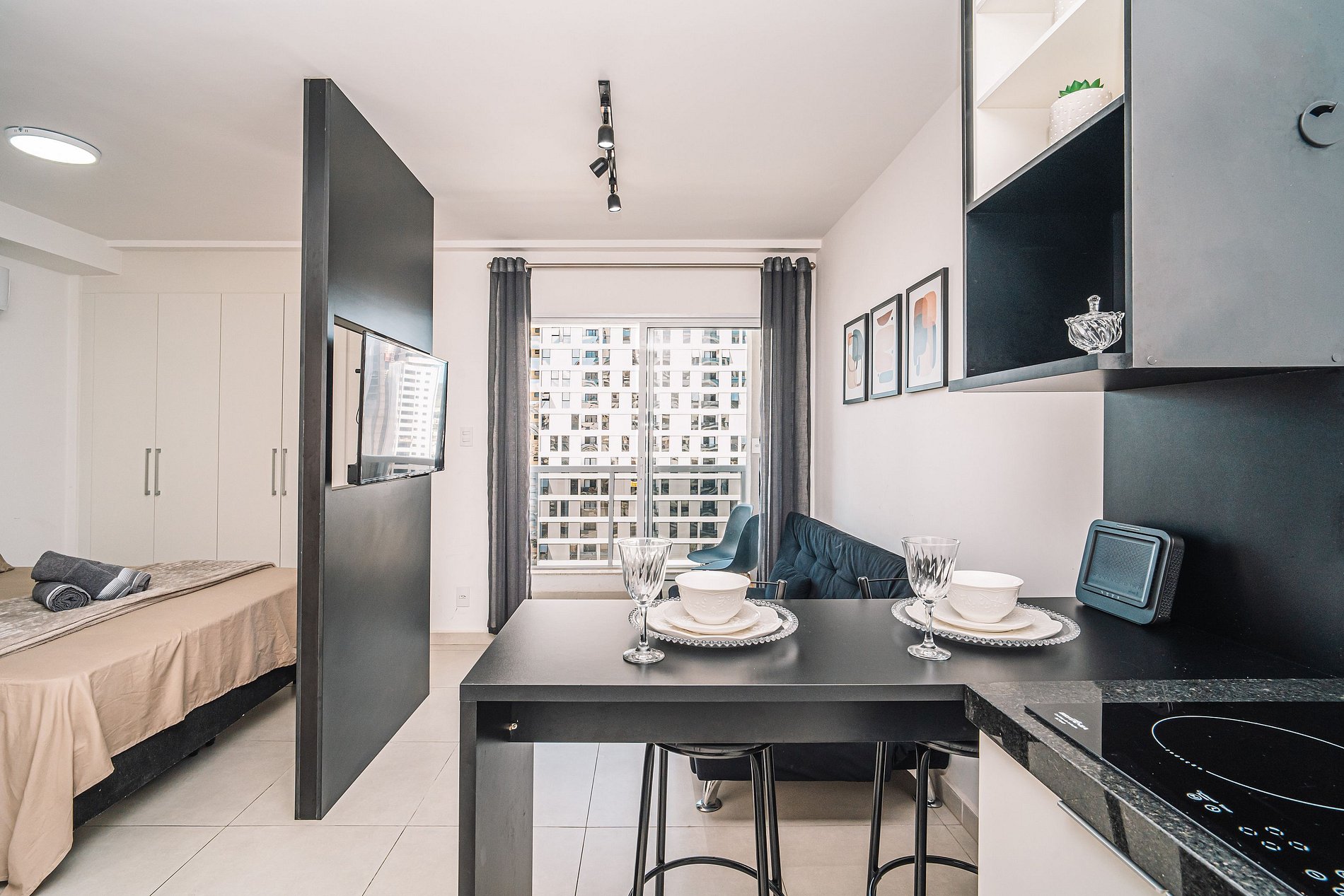 Studio equipado com cama, armário, filtro, ar-condicionado, armário de cozinha, bancada com 2 cadeiras, banheiro com Box Blindex e espelhos. Tudo para sua comodidade e conforto. Studio em ótima localização.