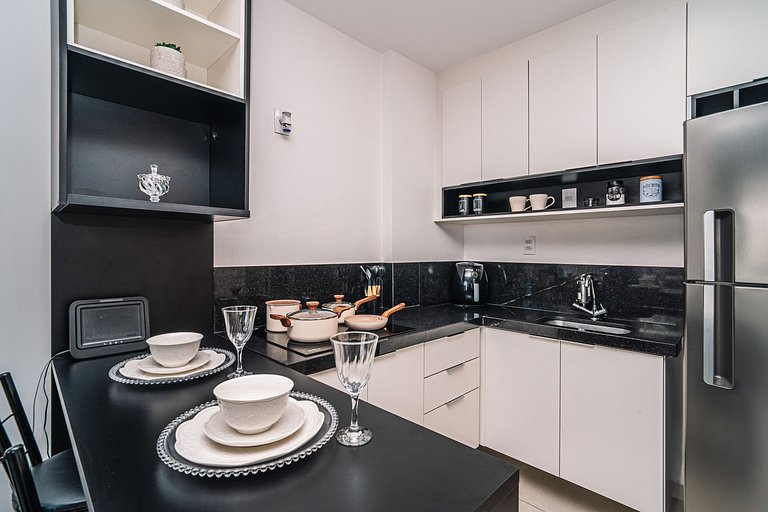 Studio equipado com cama, armário, filtro, ar-condicionado, armário de cozinha, bancada com 2 cadeiras, banheiro com Box Blindex e espelhos. Tudo para sua comodidade e conforto. Studio em ótima localização.