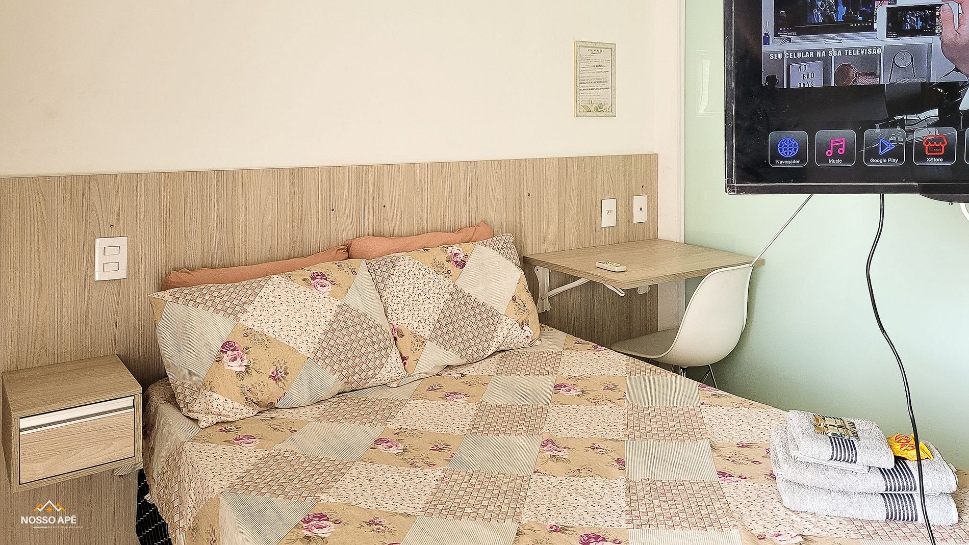 Apartamento com inúmeras tomadas, incluindo duas perto da cama.